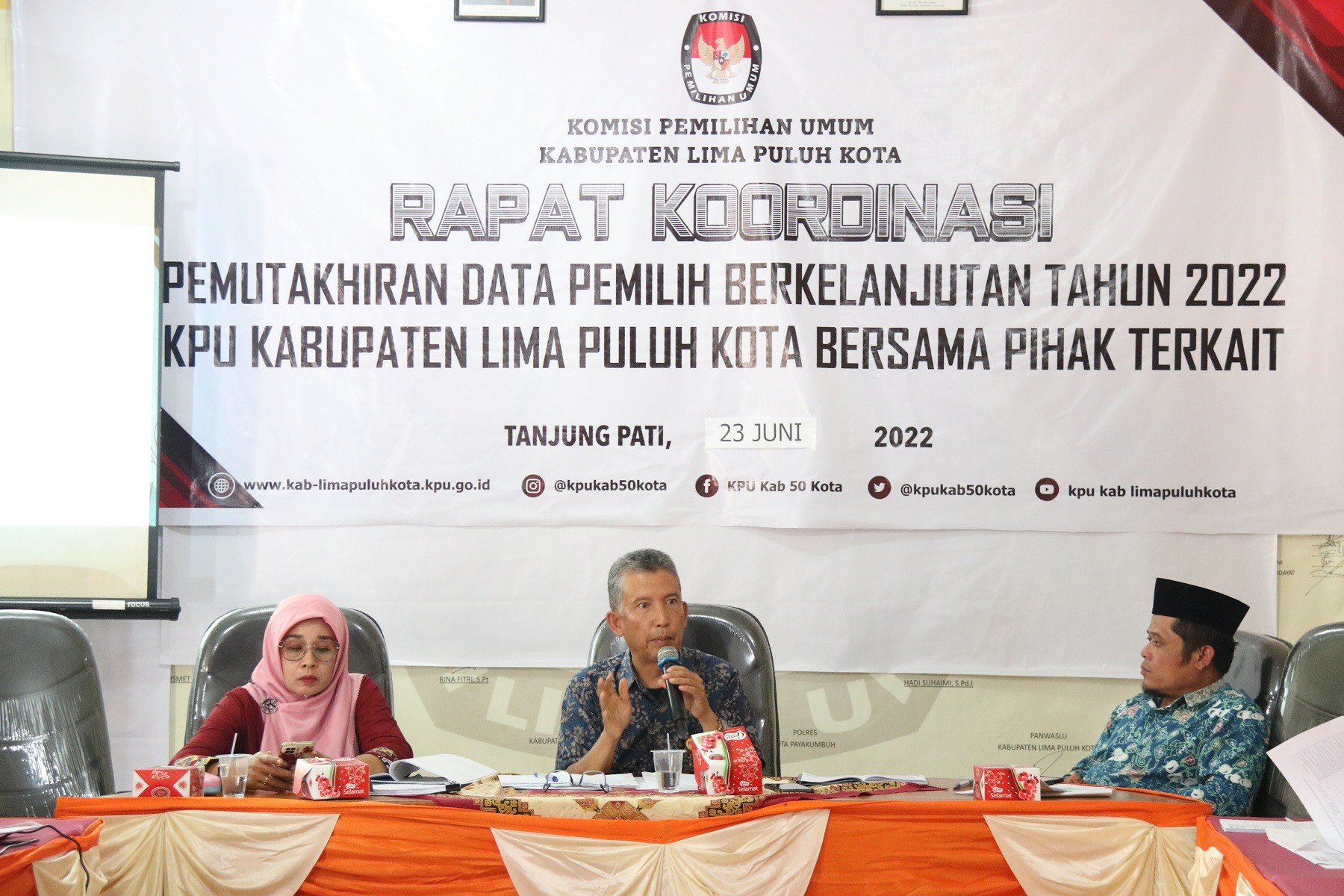 Rapat dipimpin langsung oleh Ketua KPU Kabupaten Lima Puluh Kota Masnijon, yang menjelaskan terkait pergerakan data di Kabupaten Lima Puluh Kota yang dimulai dari Maret 2021 sampai Juni 2022, perubahan data tersebut hasil dari koordinasi dan masukan data dari stakeholder terkait serta hasil penyandingan data dengan Dinas Kependudukan dan Pencatatan Sipil Kabupaten Lima Puluh Kota.