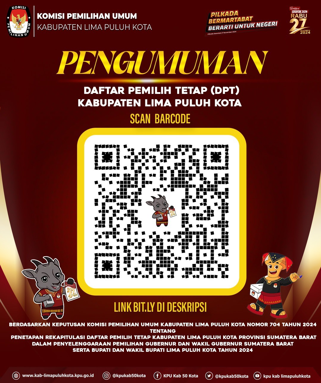 PENGUMUMAN DAFTAR PEMILIH TETAP (DPT) TINGKAT KABUPATEN LIMA PULUH KOTA DALAM PEMILIHAN SERENTAK TAHUN 2024 Minggu, 22 September 2024 07:00 750 Pengumuman DPT dapat diunduh DISINI Bagikan: Dilihat 750 Kali.
