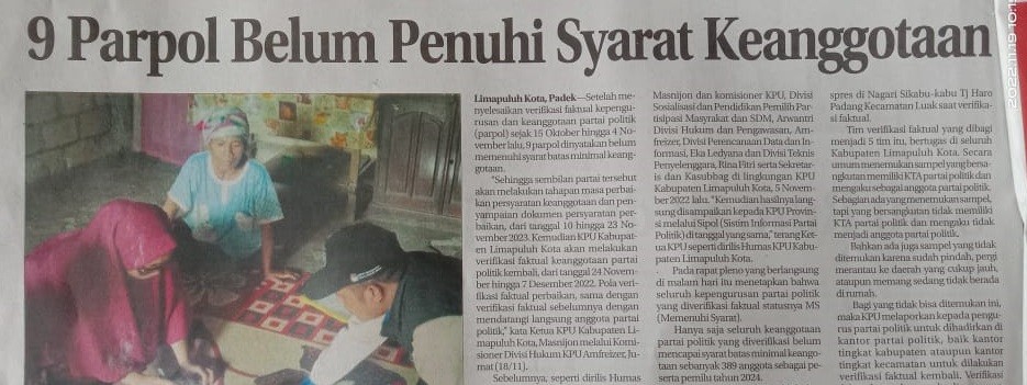 KPU Kabupaten Lima Puluh Kota telah melaksanakan verifikasi faktual terhadap keanggotaan partai politik yang berlangsung dari tanggal 19 Oktober sampai 4 November 2022 dan dalam pelaksanaannya diberitakan dalam media cetak padang ekspres yang terbit 19 November 2022. Yuk simak beritanya di bawah ini.