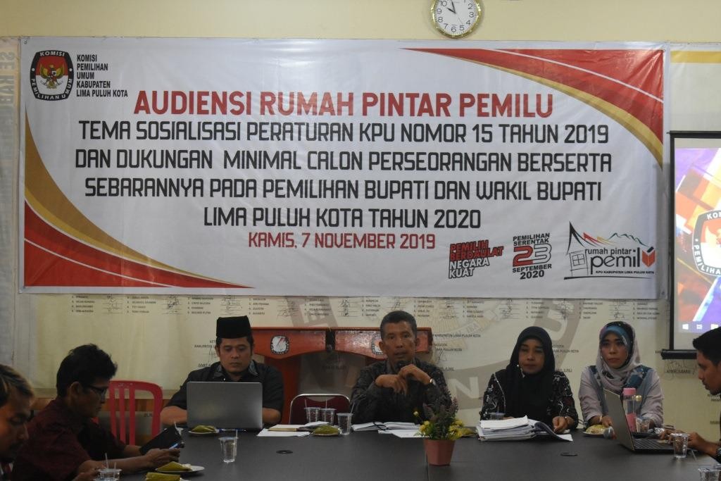“Dukungan minimal bagi calon perseorangan sebanyak 22.539 pemilih dan tersebar minimal pada 7 kecamatan di Kabupaten Lima Puluh Kota yang telah Kami tetapkan pada 26 Oktober 2019, dan nanti pengumuman resminya baru disampaikan pada 25 November 2019,” ujarnya.