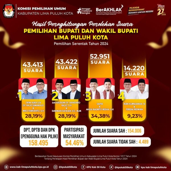 Infografis Hasil Pemilihan Bupati dan Wakil Bupati Lima Puluh Kota dan Partisipasi Tahun 2024
