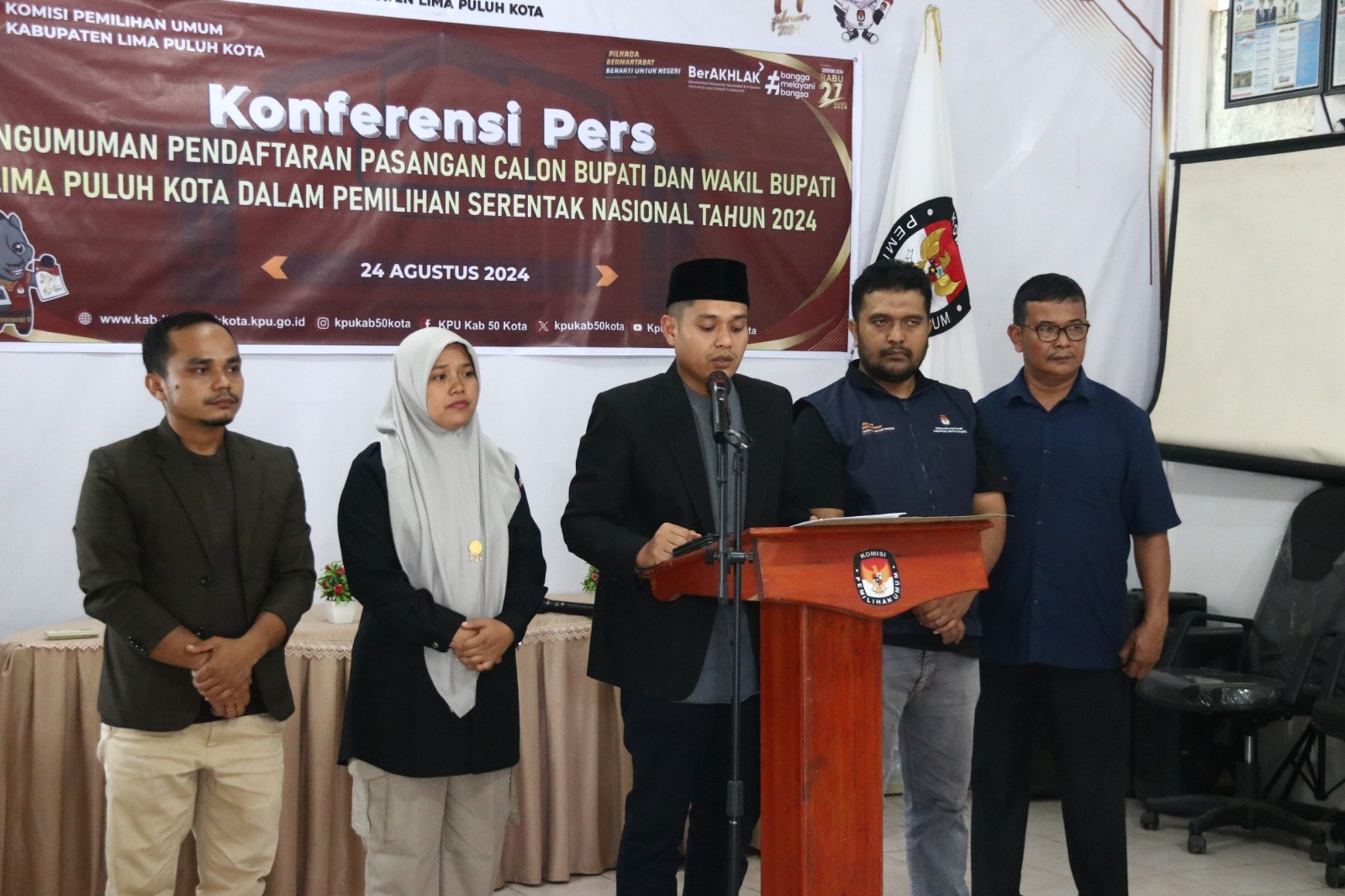 Tanjung Pati, kab-limapuluhkota.kpu.go.id – Menjelang penerimaan pendaftaran Pasangan Calon Bupati dan Wakil Bupati Lima Puluh Kota tahun 2024 pada tanggal 27 Agustus 2024, KPU Kabupaten mengumumkan Pendaftaran Pasangan Calon Bupati dan Wakil Bupati Lima Puluh Kota Tahun 2024 pada tanggal 24 Agustus 2024, selain itu KPU Kabupaten Lima Puluh Kota melaksanakan konferensi pers terkait pendaftaran tersebut yang di hadiri oleh Media.