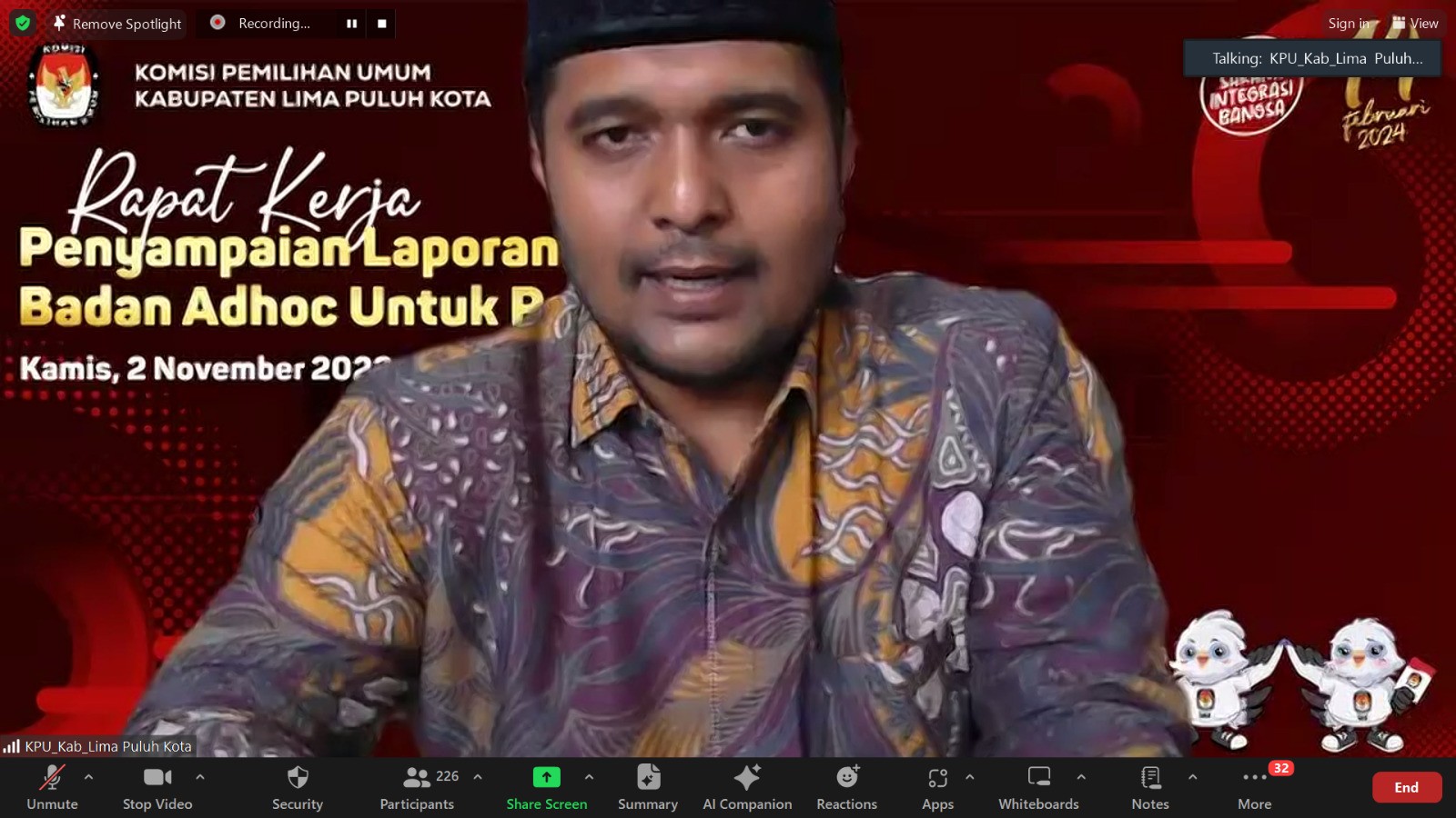 Tanjung Pati, kab-limapuluhkota.kpu.go.id - Sebagai upaya penataan kerja dilingkungan Badan Ad Hoc KPU Kabupaten Lima Puluh Kota menggelar Rapat Kerja Penyampaian Laporan Kinerja Badan Ad Hoc Pemilu 2024 yang dilaksanakan secara Daring pada tanggal 2 November 2023.