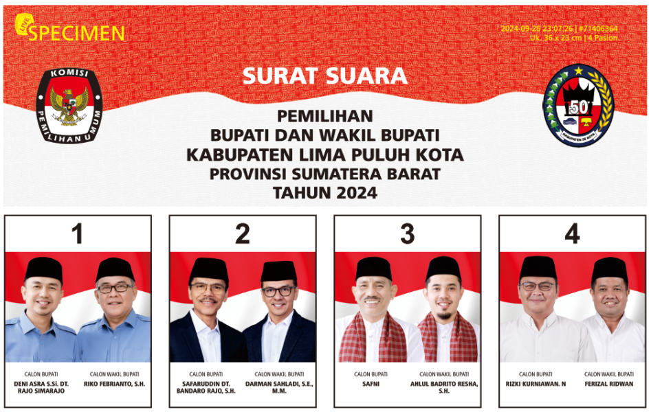 Pasangan Calon Bupati dan Wakil Bupati Lima Puluh Kota Tahun 2024 Senin, 30 September 2024 11:27 88 Daftar Pasangan Calon serta Visi dan Misi unduh DISINI Specimen Surat Suara unduh DISINI Bagikan: Dilihat 88 Kali.