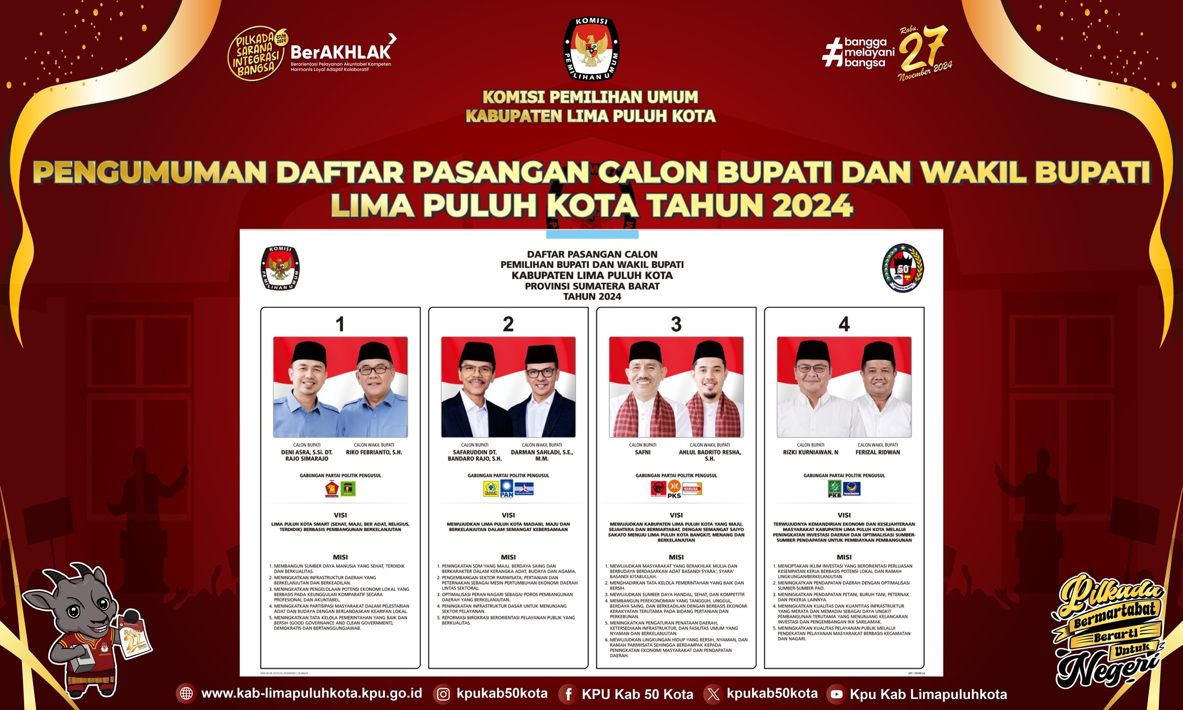 Pengumuman Daftar Pasangan Calon (DPC) Pemilihan Bupati dan Wakil Bupati Lima Puluh Kota Tahun 2024 Jumat, 04 Oktober 2024 10:00 882 Pengumuman dapat diunduh DISINI Daftar Pasangan Calon (DPC) dapat diunduh DISINI Bagikan: Dilihat 882 Kali.