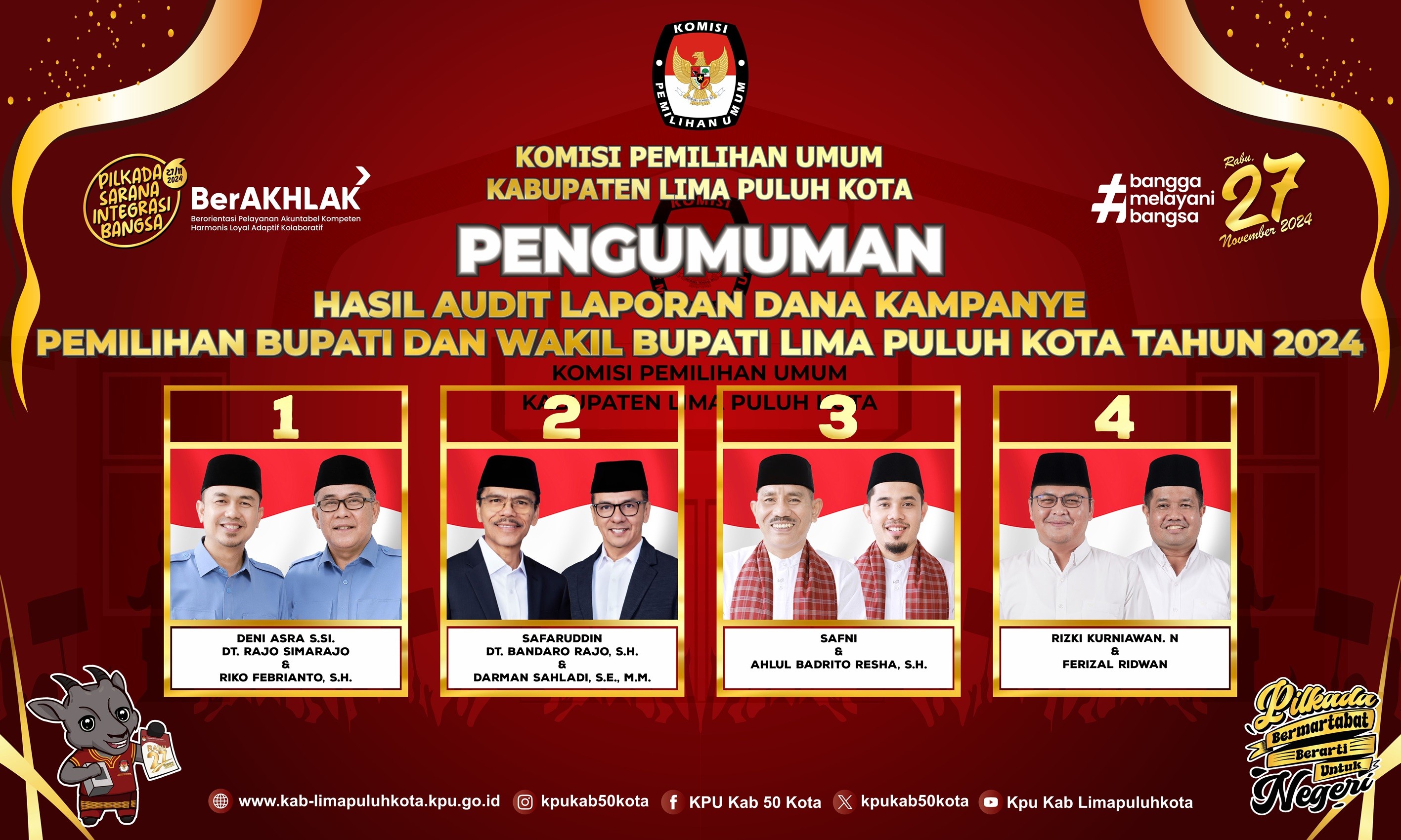 PENGUMUMAN HASIL AUDIT LAPORAN DANA KAMPANYE PEMILIHAN BUPATI DAN WAKIL BUPATI LIMA PULUH KOTA TAHUN 2024 Kamis, 12 Desember 2024 13:00 881 Pengumuman Unduh DISINI Bagikan: Dilihat 881 Kali.