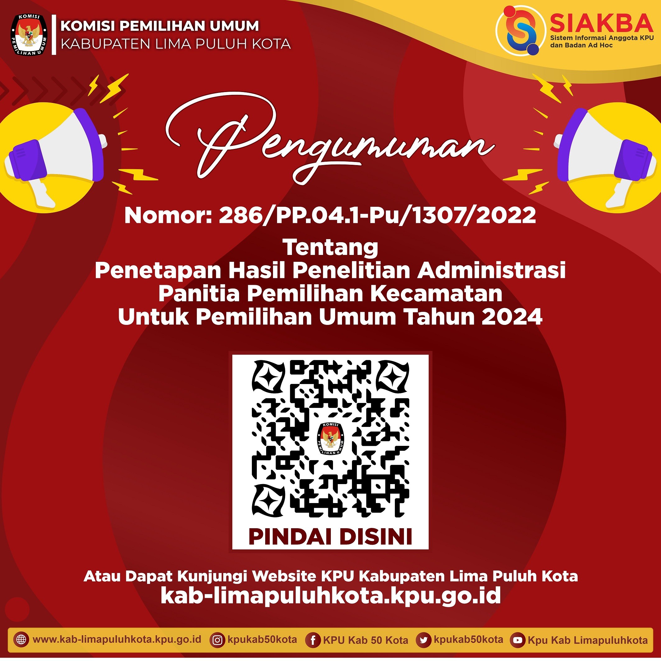 Berdasarkan Berita Acara Rapat Pleno KPU Kabupaten Lima Puluh Kota Nomor: 117/PP.04.1-BA/1307/2022 tanggal 2 Desember 2022 tentang Rapat Pleno Penetapan Hasil Penelitian Administrasi Panitia Pemilihan Kecamatan untuk Pemilu Tahun 2024.