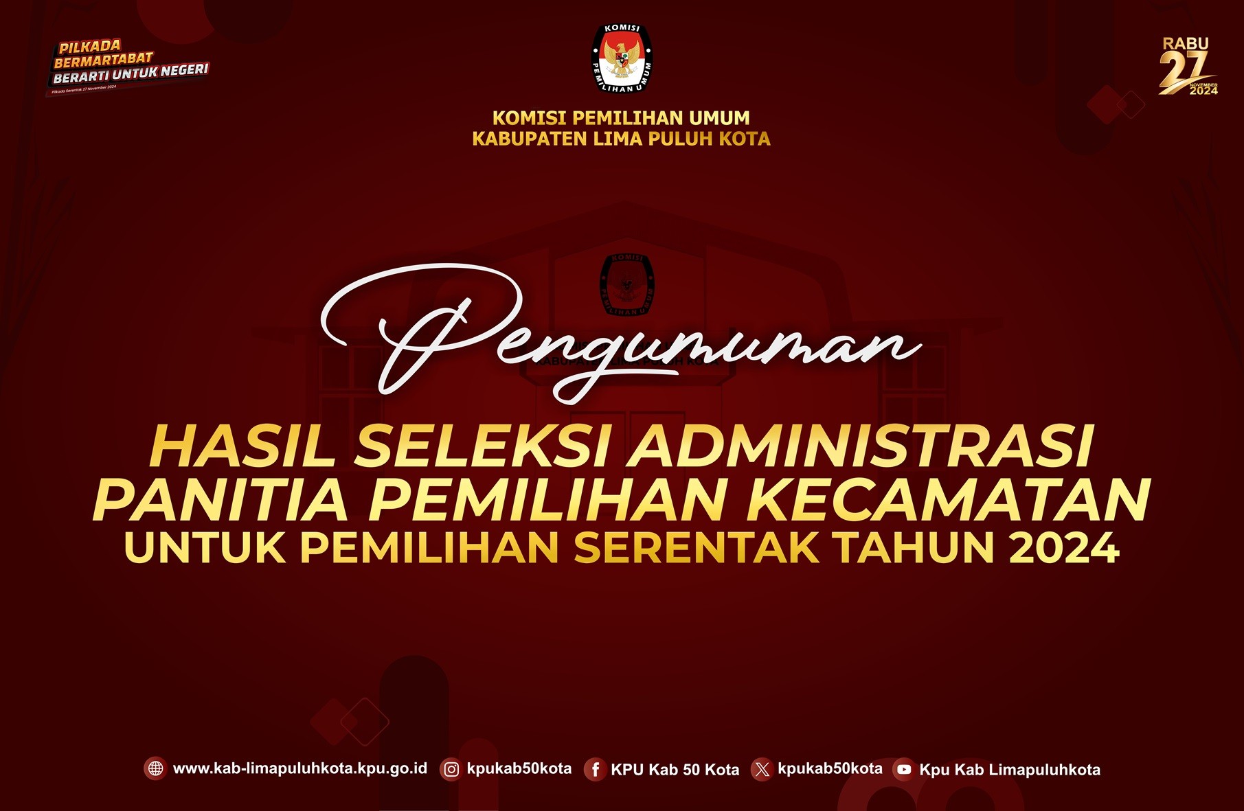 Sehubungan dengan Komisi Pemilihan Umum Kabupaten Lima Puluh Kota telah melaksanakan tahapan Penelitian Administrasi Calon Anggota Panitia Pemilihan Kecamatan untuk Pemilihan Gubernur dan Wakil Gubernur, dan Bupati dan Wakil Bupati Tahun 2024,