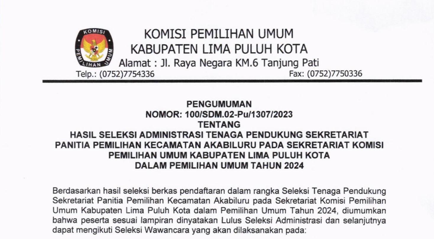 PENGUMUMAN HASIL SELEKSI ADMINISTRASAI TENAGA PENDUKUNG SEKRETARIAT PPK AKABILURU PEMILU 2024 Senin, 07 Agustus 2023 11:00 139 pengumumannya dapat diunduh DISINI Bagikan: Dilihat 139 Kali.