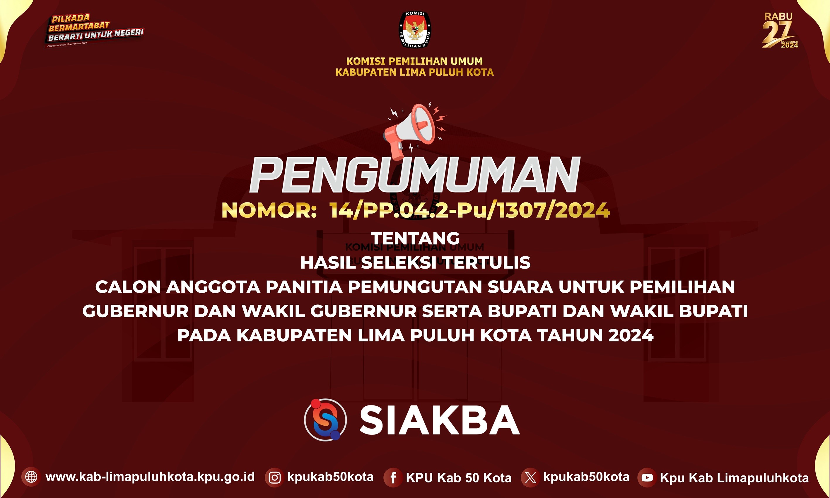 PENGUMUMAN HASIL SELEKSI TERTULIS CALON ANGGOTA PPS UNTUK PEMILIHAN SERENTAK TAHUN 2024 Minggu, 19 Mei 2024 21:00 823 Pengumuman Dapat di Unduh DISINI Format Tanggapan Masyarakat di Unduh DISINI Bagikan: Dilihat 823 Kali.