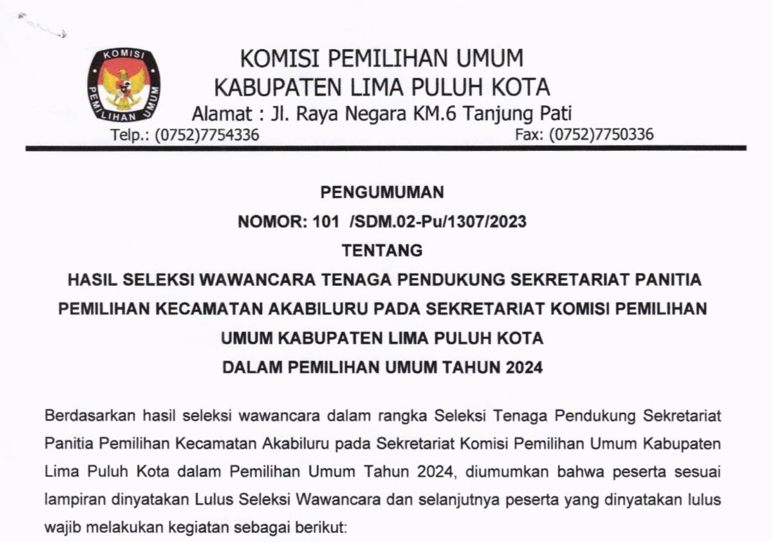 PENGUMUMAN HASIL SELEKSI WAWANCARA TENAGA PENDUKUNG SEKRETARIAT PPK AKABILURU PEMILU 2024 Jumat, 11 Agustus 2023 10:00 122 pengumumannya dapat diunduh DISINI Bagikan: Dilihat 122 Kali.