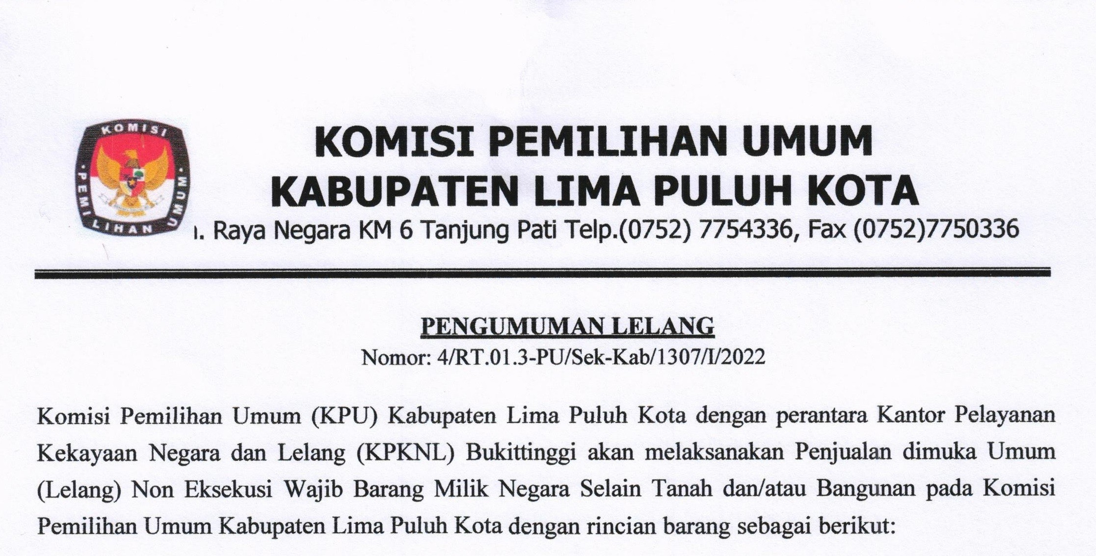 Tanjung Pati, kab-limapuluhkota.kpu.go.id - Pengumuman Nomor 4/RT.01.3-PU/Sek-Kab/1307/I/2022 Tentang Lelang Barang Milik Negara selain Tanah dan/atau Bangunan.