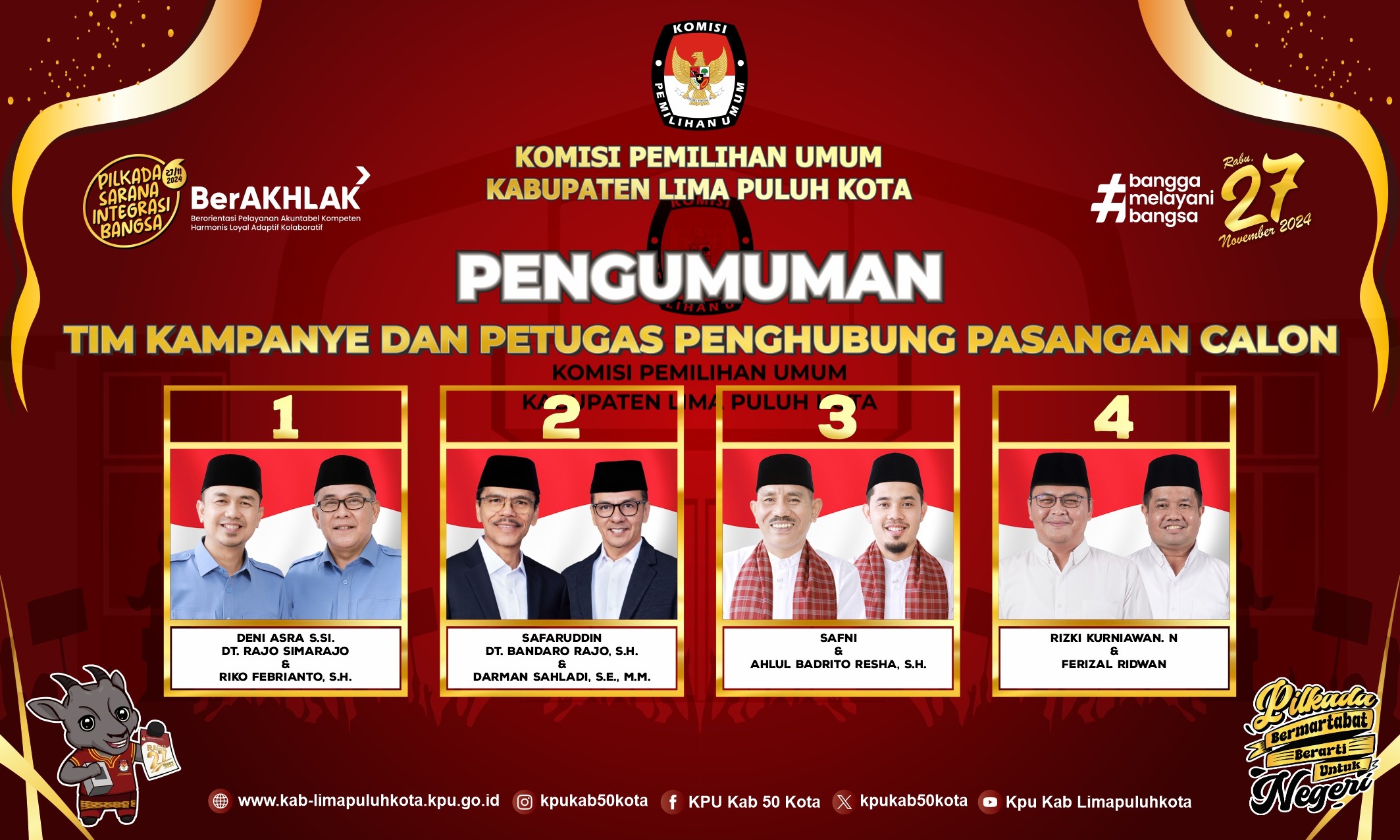 Pengumuman Nama Tim Kampanye dan Petugas Penghubung Pasangan Calon Bupati dan Wakil Bupati Lima Puluh Kota Tahun 2024