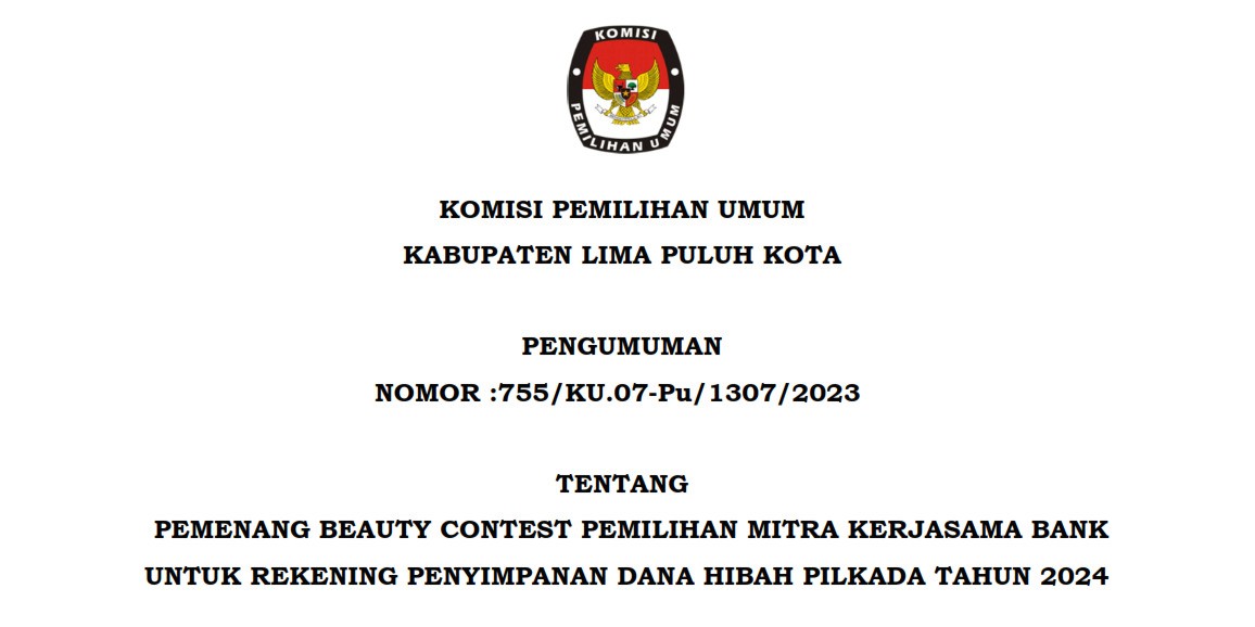Berdasarkan Berita Acara Nomor 434/PK.01-BA/1307/2023 tentang Hasil Beauty Contest Pemilihan Mitra Kerjasama Bank Untuk Rekening Penyimpanan Dana Hibah Pilkada Tahun 2024.