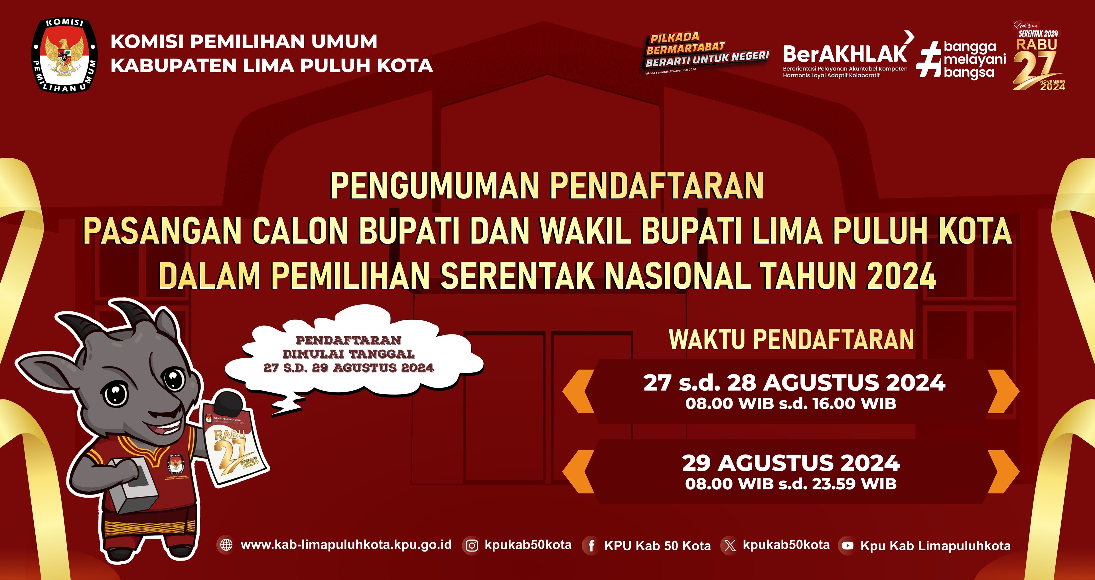 PENGUMUMAN PENDAFTARAN PASLON BUPATI DAN WAKIL BUPATI LIMA PULUH KOTA TAHUN 2024 Sabtu, 24 Agustus 2024 09:00 745 PENGUMUMAN DAPAT DI UNDUH DISINI MODEL PERMOHONAN SILON DISINI Bagikan: Dilihat 745 Kali.
