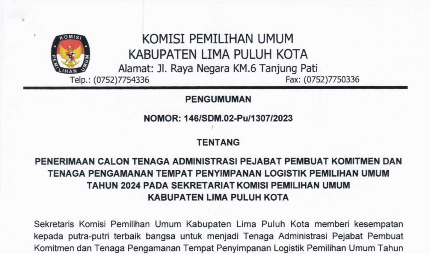 2024 di lingkungan KPU Kabupaten Lima Puluh Kota Tahun Anggaran 2023, Pengumumannya dapat dilihat unduh dibawah ini.