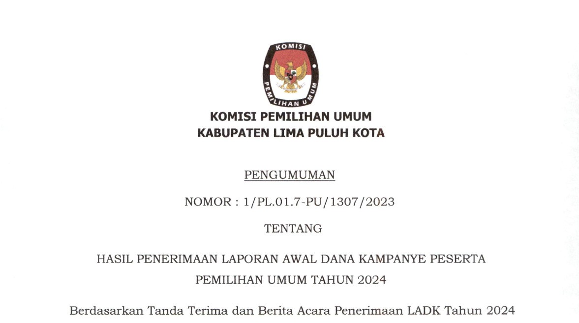PENGUMUMAN PENERIMAAN LAPORAN AWAL DANA KAMPANYE (LADK) PARTAI POLITIK PESERTA PEMILU 2024 Senin, 08 Januari 2024 14:00 98 DOWNLOAD DISINI!!! Bagikan: Dilihat 98 Kali.