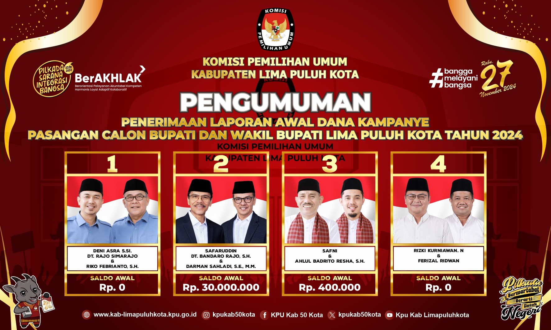 Pengumuman Penerimaan Laporan Awal Dana Kampanye Pemilihan Bupati dan Wakil Bupati Lima Puluh Kota Tahun 2024 Sabtu, 28 September 2024 14:00 689 Pengumuman Penerimaan LADK dapat diunduh DISINI Pengumuman Penerimaan LADK Perbaikan dapat diunduh DISINI Bagikan: Dilihat 689 Kali.