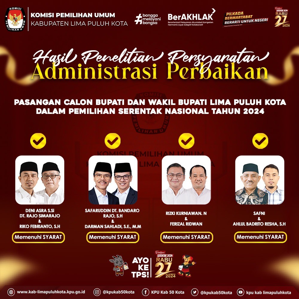 PENGUMUMAN PENERIMAAN MASUKAN DAN TANGGAPAN MASYARAKAT TERHADAP PASANGAN CALON BUPATI DAN WAKIL BUPATI LIMA PULUH KOTA PADA PEMILIHAN TAHUN 2024 Jumat, 13 September 2024 19:00 684 PENGUMUMAN DAPAT DI UNDUH DISINI DOKUMEN VISI DAN MISI PASANGAN CALON DAPAT DI UNDUH DISINI Bagikan: Dilihat 684 Kali.