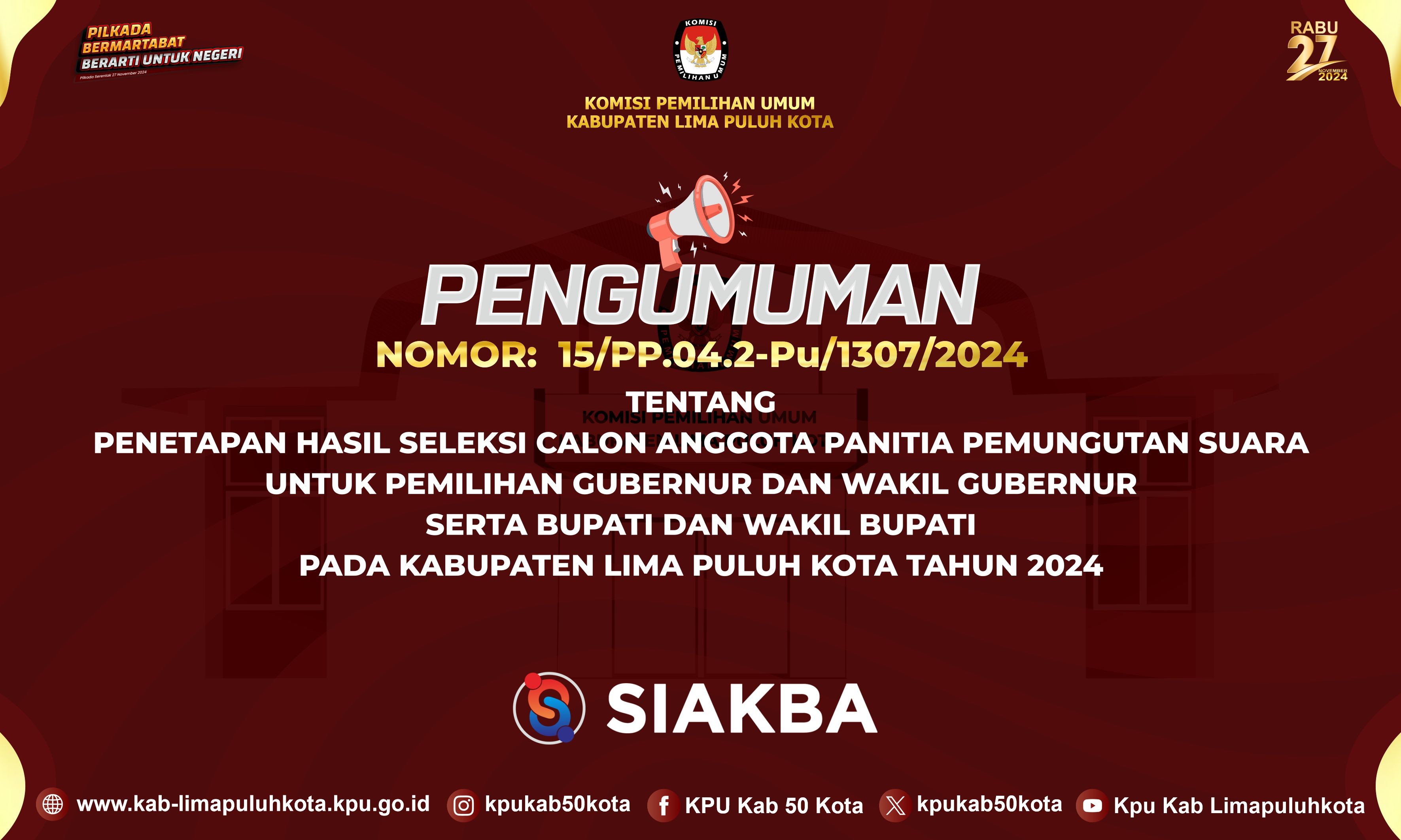 PENGUMUMAN PENETAPAN HASIL SELEKSI CALON ANGGOTA PPS UNTUK PEMILIHAN SERENTAK NASIONAL TAHUN 2024 Jumat, 24 Mei 2024 23:00 1218 Pengumuman Dapat di Unduh DISINI Bagikan: Dilihat 1,218 Kali.