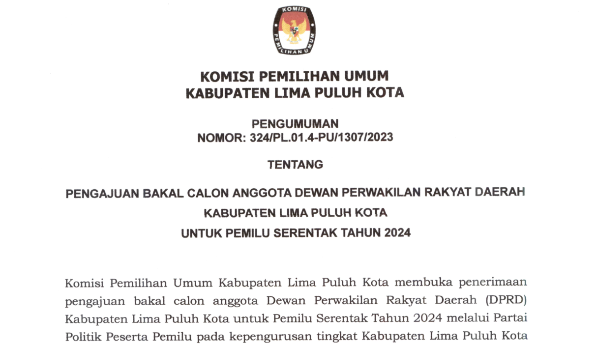 PENGUMUMAN PENGAJUAN BACALON ANGGOTA DPRD KABUPATEN LIMA PULUH KOTA