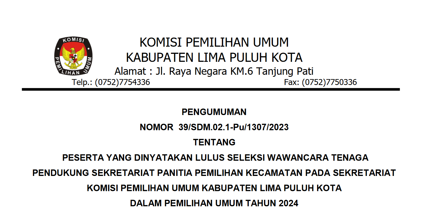 PENGUMUMAN PESERTA LULUS SELEKSI WAWANCARA TENAGA PENDUKUNG SEKRETARIAT PPK PADA SEKRETARIAT KPU KABUPATEN LIMA PULUH KOTA DALAM PEMILU TAHUN 2024