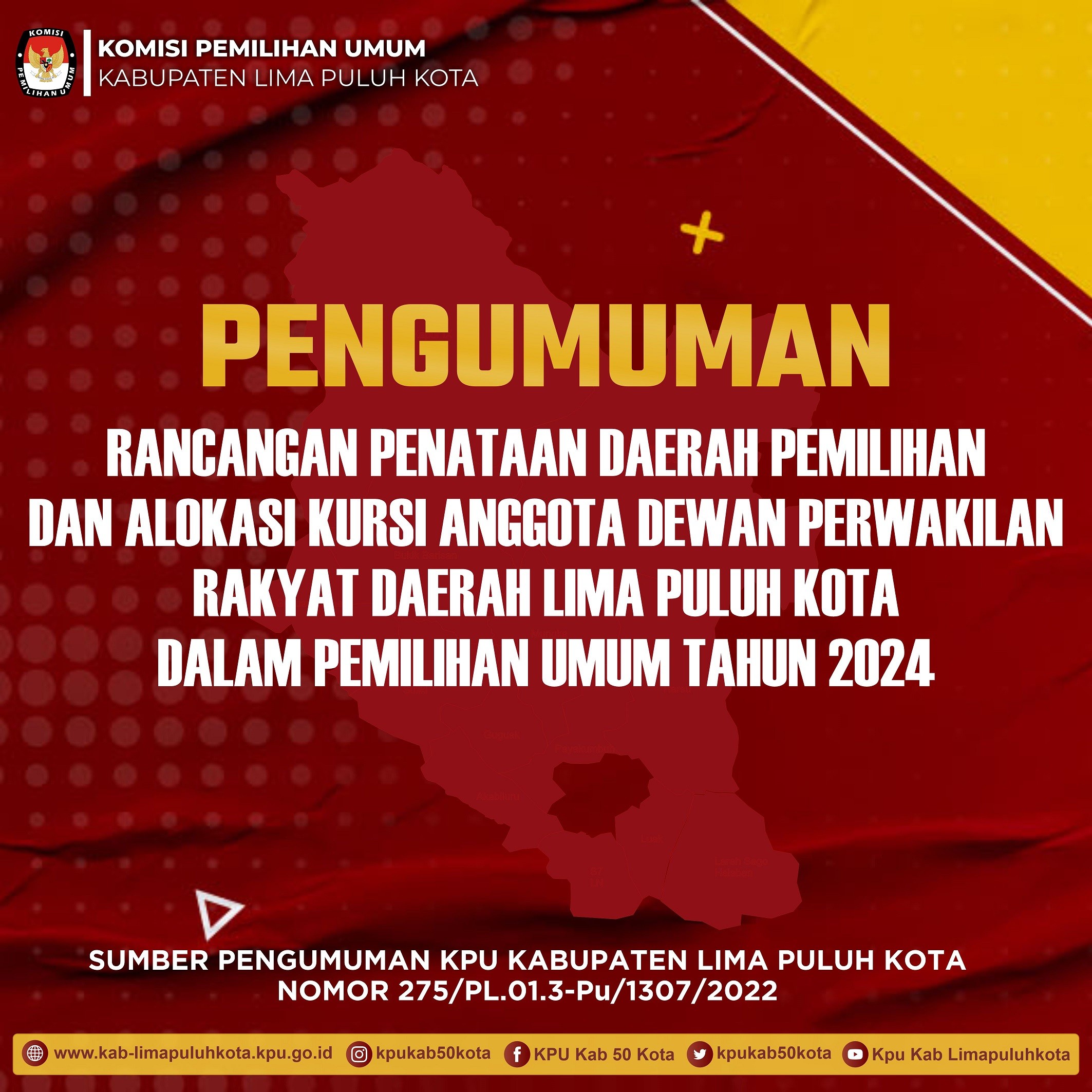 Berdasarkan Berita Acara Komisi Pemilihan Umum Kabupaten Lima Puluh Kota Nomor : 111/PK.01-BA/1307/2022 tentang Rancangan Penataan Daerah Pemilihan dan Alokasi Kursi Anggota Dewan Perwakilan Rakyat Daerah Kabupaten Lima Puluh Kota dalam Pemilihan Umum Tahun 2024, dengan ini mengumumkan Rancangan Penataan Daerah Pemilihan dan Alokasi Kursi Anggota Dewan Perwakilan Rakyat Daerah Kabupaten Lima Puluh Kota dalam Pemilihan Umum Tahun 2024 untuk dapat mendapatkan tanggapan dan masukan masyarakat sebagaimana tercantum dalam lampiran pengumuman ini.