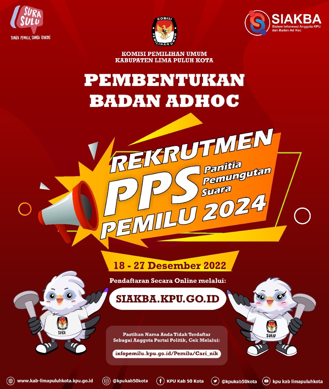 Dalam rangka pembentukan Panitia Pemungutan Suara (PPS) untuk Pemilihan Umum, Komisi Pemilihan Umum Kabupaten Lima Puluh Kota mengundang Warga Negara Indonesia yang memenuhi persyaratan untuk mendaftarkan diri menjadi anggota Panitia Pemungutan Suara untuk Pemilihan Umum, dapat dilihat di Pengumuman: