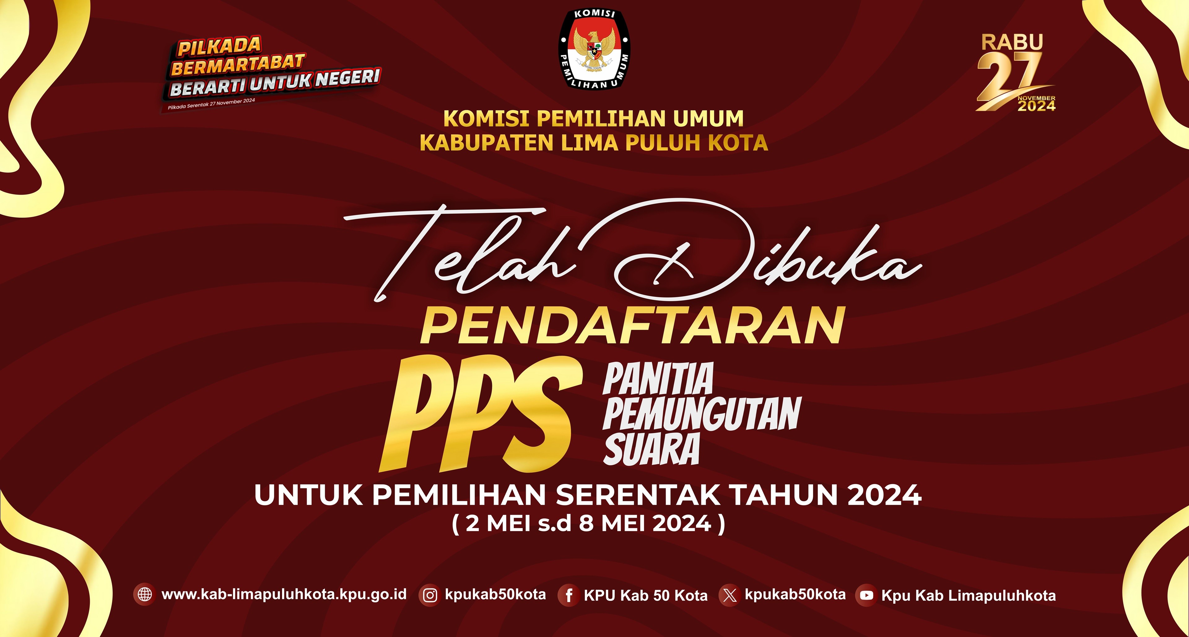 Dalam rangka pembentukan Calon Anggota Panitia Pemungutan Suara untuk Pemilihan Gubernur dan Wakil Gubernur, Bupati dan Wakil Bupati Tahun 2024, Komisi Pemilihan Umum Kabupaten Lima Puluh Kota mengundang Warga Negara Indonesia yang memenuhi kualifikasi untuk mendaftarkan diri menjadi Panitia Pemungutan Suara untuk Pemilihan Gubernur dan Wakil Gubernur, Bupati dan Wakil Bupati.