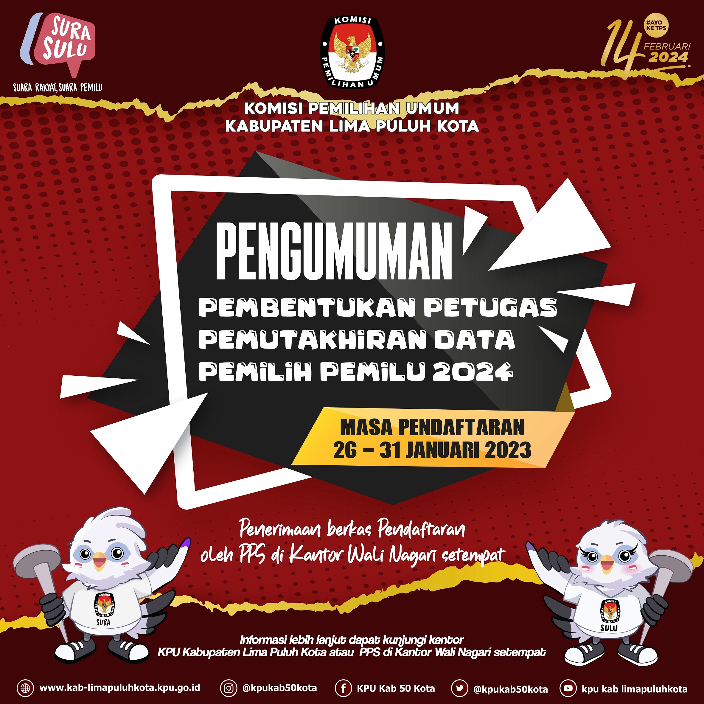 Teman Pemilih, KPU Kabupaten Lima Puluh Kota melalui Panitia Pemungutan Suara (PPS) membuka pendaftaran calon Petugas Pemutakhiran Data Pemilih (PANTARLIH) Untuk Pemilu Tahun 2024, pengumumannya dan pengantaran berkas pendaftaran dapat diserahkan kepada PPS di Nagari setempat.
