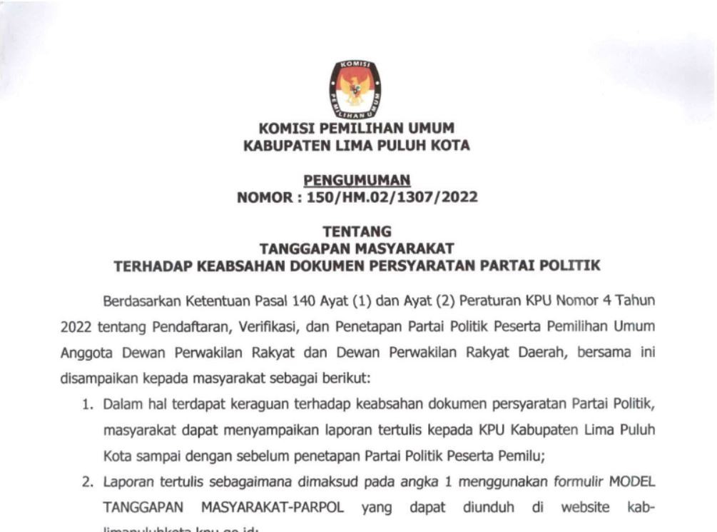 Pengumuman Tentang Tanggapan Masyarakat Terhadap Keabsahan Dokumen Persyaratan Partai Politik