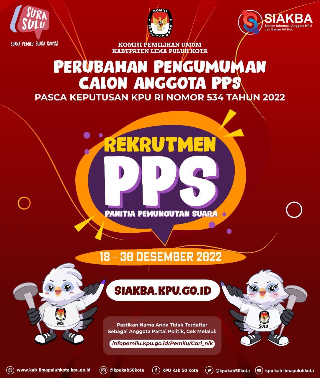 Sehubungan dengan terbitnya Keputusan Komisi Pemilihan Umum Nomor 534 Tahun 2022 tentang Perubahan atas Keputusan Komisi Pemilihan Umum Nomor 476 Tahun 2022 tentang Pedoman Teknis Pembentukan Badan Adhoc Penyelenggara Pemilihan Umum dan Pemilihan Gubernur dan Wakil Gubernur, Bupati dan Wakil Bupati, dan Walikota dan Wakil Walikota yang mengatur mengenai perubahan jadwal pembentukan PPS di dalamnya, lengkapnya dapat dilihat di Pengumuman.
