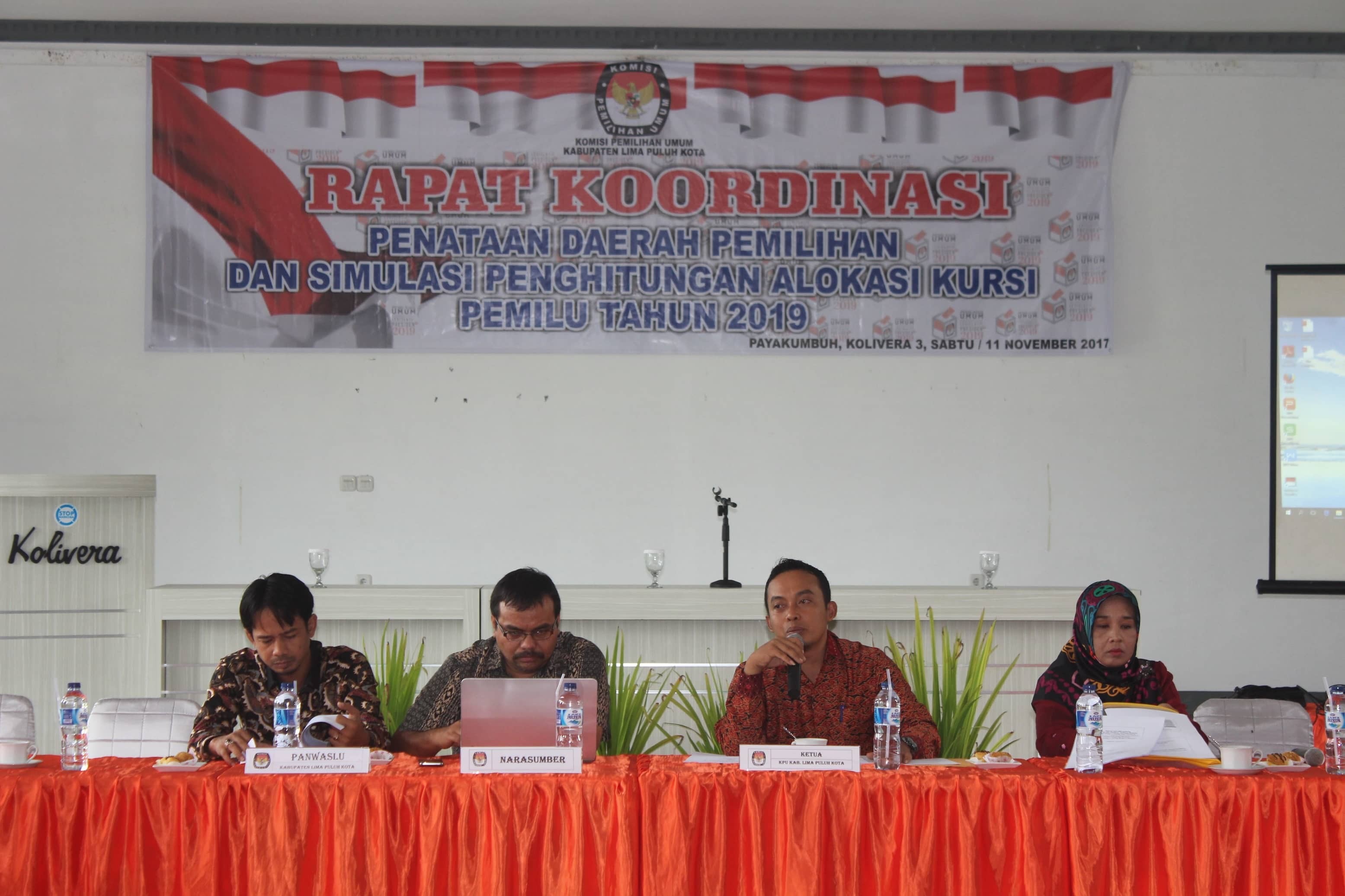 Tanjung Pati, kab-limapuluhkota.kpu.go.id. Dalam rangka persiapan pelaksanaan Pemilihan Umum Legislatif (Pileg) tahun 2019 mendatang, Komisi Pemilihan Umum (KPU) Kabupaten Lima Puluh Kota menggelar Rapat Koordinasi (Rakor) Penataan Daerah Pemilihan (Dapil) dan Simulasi Penghitungan Alokasi Kursi Pemilu Tahun 2019. Rakor tersebut diselenggarakan di ballroom salah satu hotel yang berlokasi di Payakumbuh sekitar pukul 08.00 WIB dan diikuti oleh pimpinan Partai Politik calon peserta Pemilu Tahun 2019, sejumlah SKPD, Ormas, LSM, Kapolres, Dandim, Panwas dan stakeholder terkait lainnya.