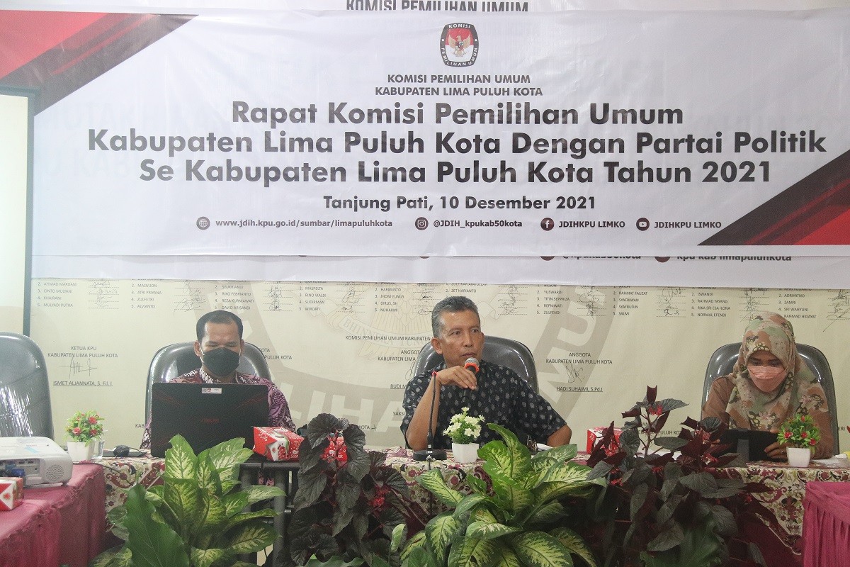 Akan hal tersebut KPU Kabupaten Lima Puluh Kota menggelar Rapat bersama pimpinan partai politik se Kabupaten Lima Puluh Kota serta Bawaslu Kabupaten Lima Puluh Kota di Aula Kantor KPU Kabupaten Lima Puluh Kota Jumat 10 Desember 2021.