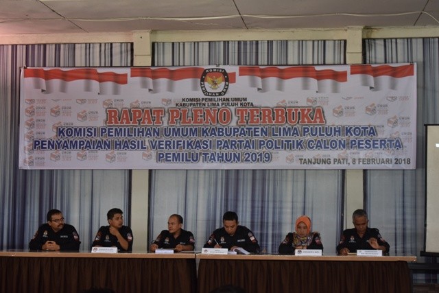 KPU Lima Puluh Kota melaksanakan Rapat Pleno Terbuka Penetapan Hasil Verifikasi Partai Politik Calon Peserta Pemilu Tahun 2019, pada hari kamis tanggal 8 Februari 2018 di Sago Bungsu Tanjung Pati. Acara dimulai sekitar pukul 14.00 WIB yang dihadiri oleh Bupati Lima Puluh Kota yang diwakili oleh Sekda, DPRD Lima Puluh Kota, Polres Lima Puluh Kota, Polres Kota Payakumbuh, Ketua Panwaslu beserta anggota, Kesbangpol, Pimpinan Partai politik dari 15 partai yang telah diverifikasi yaitu BERKARYA, DEMOKRAT, GARUDA, GERINDRA, GOLKAR, HANURA, NASDEM, PAN, PBB,PDI-P, PERINDO, PKB, PKS, PPP, dan PSI