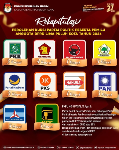 Rekapitulasi Perolehan Kursi Partai Politik Anggota DPRD Lima Puluh Kota Tahun 2024