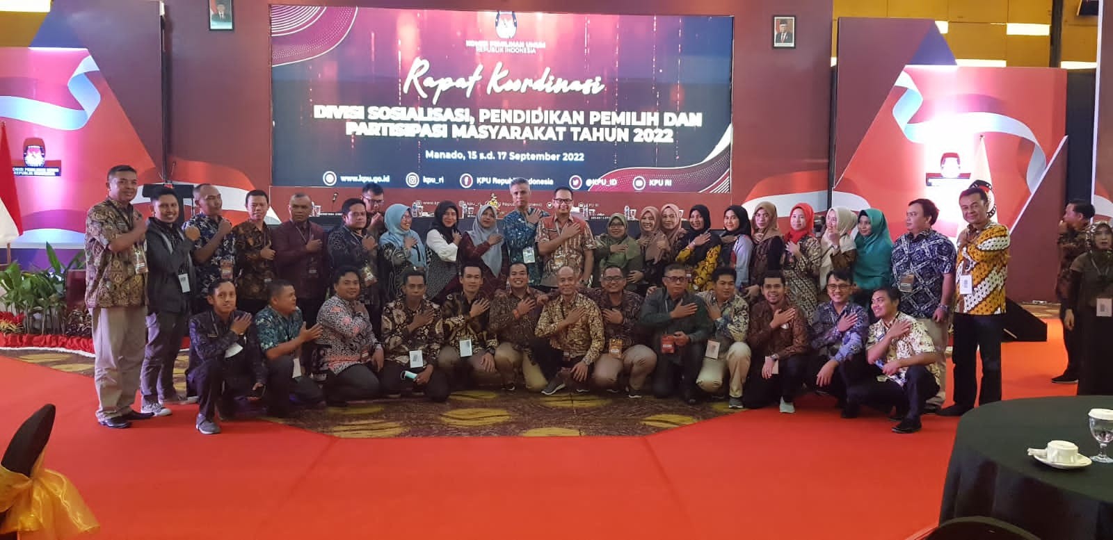 Tanjung Pati, kab-limapuluhkota.kpu.go.id - Ketua Divisi Sosialisasi, Pendidikan Pemilih dan Partisipasi Masyarakat Arwantri bersama dengan Kasubag Teknis Parhupmas KPU Kabupaten Lima Puluh Kota Hendra Riski Saputra mengikuti Rapat Koordinasi Divisi Sosialisasi, Pendidikan Pemilih dan Partisipasi Masyarakat Tahun 2022 seluruh Indonesia yang diadakan oleh KPU RI bertempat di Kota Manado yang dijuluki dengan Kota Nyiur Melambai selama tiga hari pada tanggal 15 sampai 17 September 2022. Dalam arahannya Agust Mellaz yang membidangi Divisi Sosialisasi, Pendidikan Pemilih dan Partisipasi Masyarakat menyampaikan Pentingnya bagi KPU dan jajarannya untuk melakukan sosialisasi dan pendidikan pemilih berkelanjutan sehingga pesan-pesan pemilu tersampaikan dengan baik, yang tujuan akhirnya adalah meningkatkan partisipasi pemilih baik dari segi kualitas maupun dari segi kuantitas. Untuk itu KPU dengan segenap jajarannya butuh kerjasama dengan multipihak. Kerjasama dengan partai politik dan peserta pemliu, kerjasama dengan organisasi masyarakat sipil, akademisi, dan profesional, serta kerjasama dengan pemerintah dan pihak-pihak lainnya. “Setiap elemen tersebut baik lembaga formal maupun non-formal memiliki irisan yang menggambarkan masing-masing dapat mengambil peran dalam pelaksanaan demokrasi dan pemilu. KPU dan jajaran hanya perlu menginisiasi dan menjalankan pola kerjasama multipihak dengan bermacam-macam program sosialisasi dan pendidikan pemilih. Konsep kerjasama multipihak ini akan menjadi pondasi dasar dalam mewujudkan Pemilu sebagai sarana integrasi bangsa”, ujar Agust Mellaz ketika tampil sebagai narasumber pada diskusi panel yang pertama.