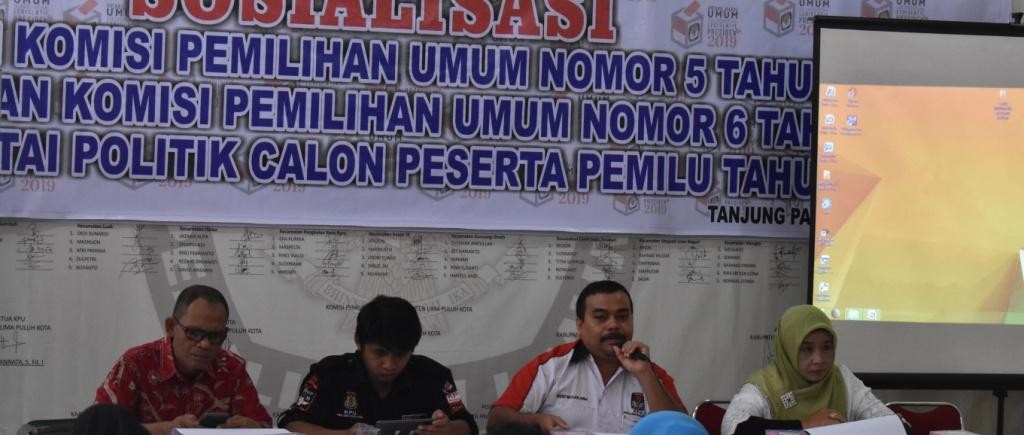 Tanjung Pati, kab-limapuluhkota.kpu.go.id. KPU Kabupaten Lima Puluh Kota menyelenggarakan Kegiatan Sosialisasi PKPU Nomor 5 dan 6 Tahun 2018 yang bertempat di aula KPU Kabupaten Lima Puluh Kota, pada hari Jumat tanggal 26 Januari 2018. Kegiatan Sosialisasi tersebut dihadiri oleh Ketua KPU beserta Anggota, Ketua Panwaslu beserta Anggota, Ketua dan Penghubung Partai Politik, Polres 50 Kota dan Kota Payakumbuh, Sekretaris , Kasubag dan Staff di lingkungan KPU Kabupaten Lima Puluh Kota.