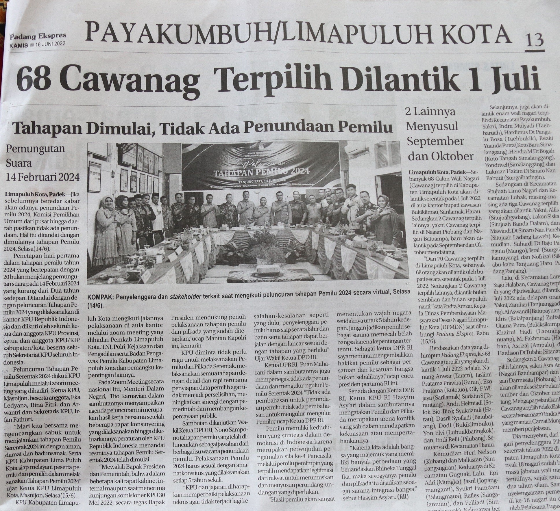 Tahapan Dimulai, TIdak Ada Penundaan Pemilu adalah Berita Kegiatan KPU Kabupaten LIma Puluh Kota yang diterbitkan oleh Media Cetak Padang Ekspres pada 16 Juni 2022 untuk berita selengkapnya dapat dilihat di bawah