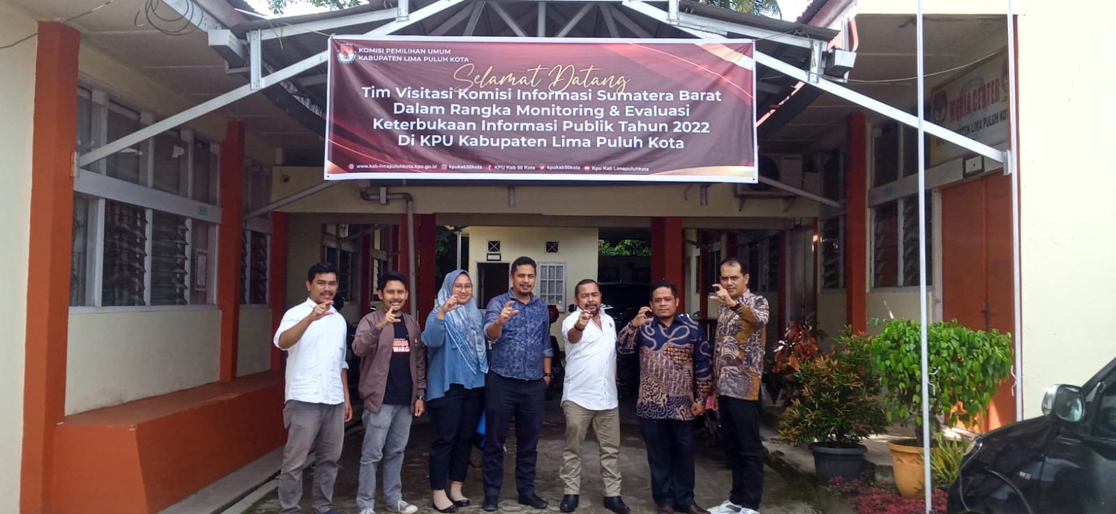 Acara visitasi ini ditutupkan dengan foto bersama antara unsur PPID KPU Kabupaten Lima Kota dan KI Sumatera Barat di depan spanduk ucapan selamat datang kepada rombongan KI Sumatera Barat. (humas kpu50kota)